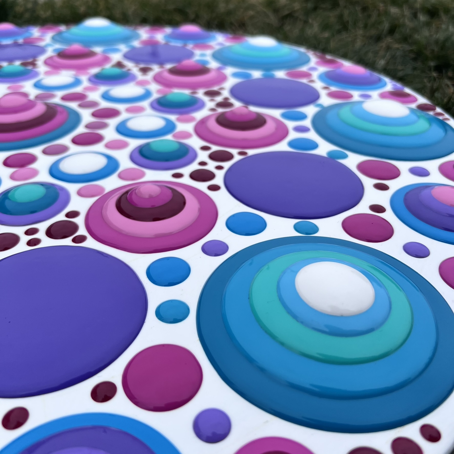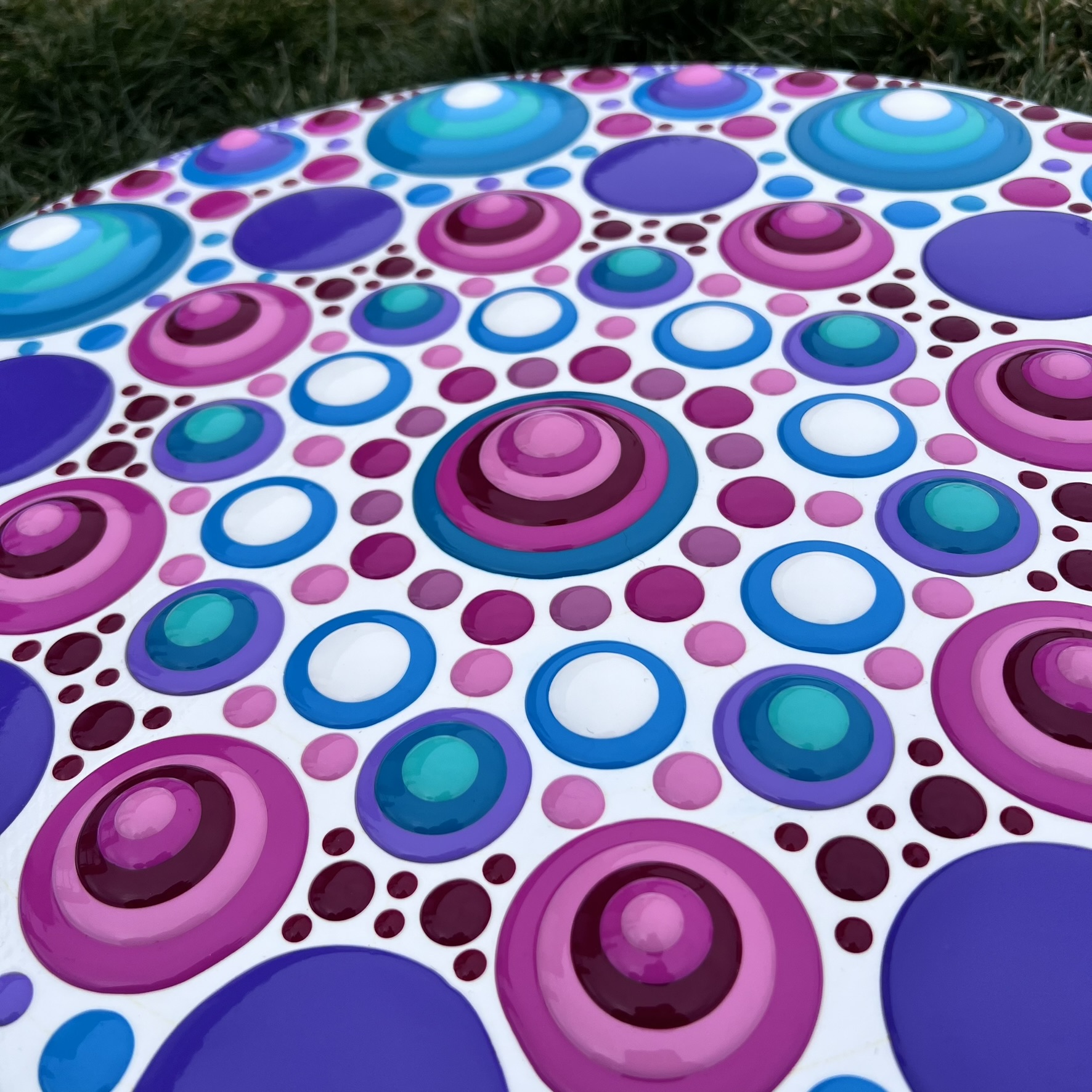 Large 24″ round mandala blob painting with bright colors of pinks, purples and blues and sealed with a gloss finish.