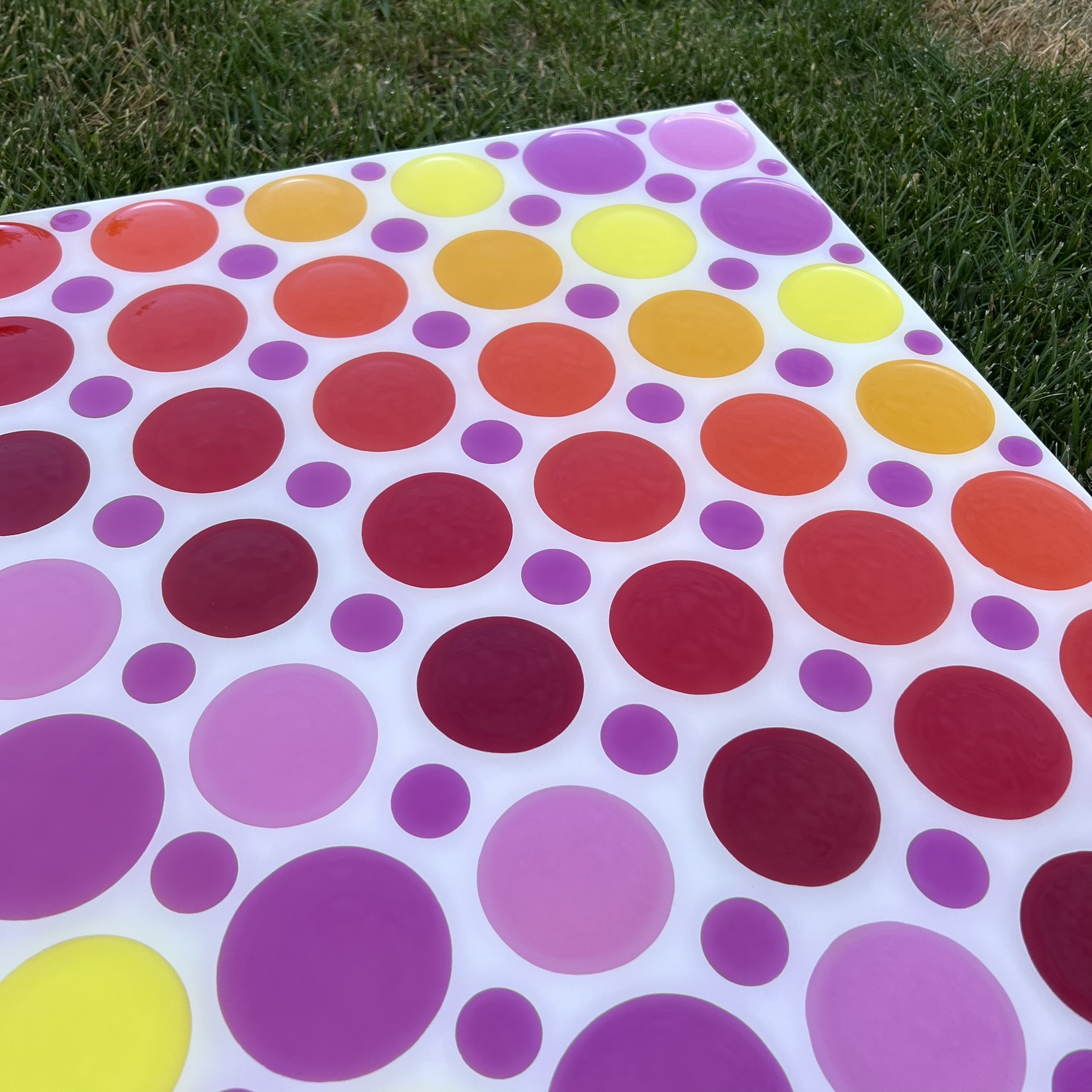 24″x24″ single layer dot painting. Uniform single layer dots in reds, oranges, yellows and pinks and covered in resin.